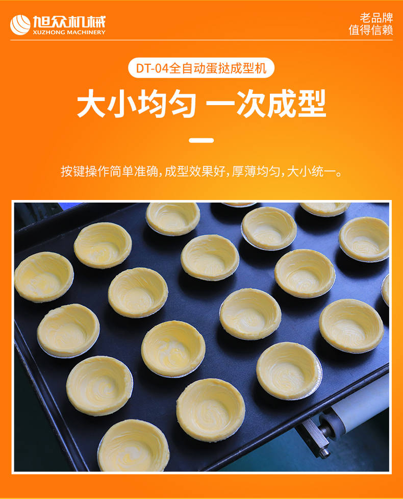 DT-04全自動蛋撻成型機,2-3秒快速成型。該機應用於傳統蛋撻、葡式蛋撻及其它須印型之產品突破傳統用手捏,采用微電子控製成型,一個2-3秒,高效率。大小均勻一次成型按鍵操作簡單準確,成型效果好,厚薄均勻,大小統-。層層起酥層次分明好葡式蛋撻皮,千層酥皮、鬆脆可口、唇齒留香、一口難忘。