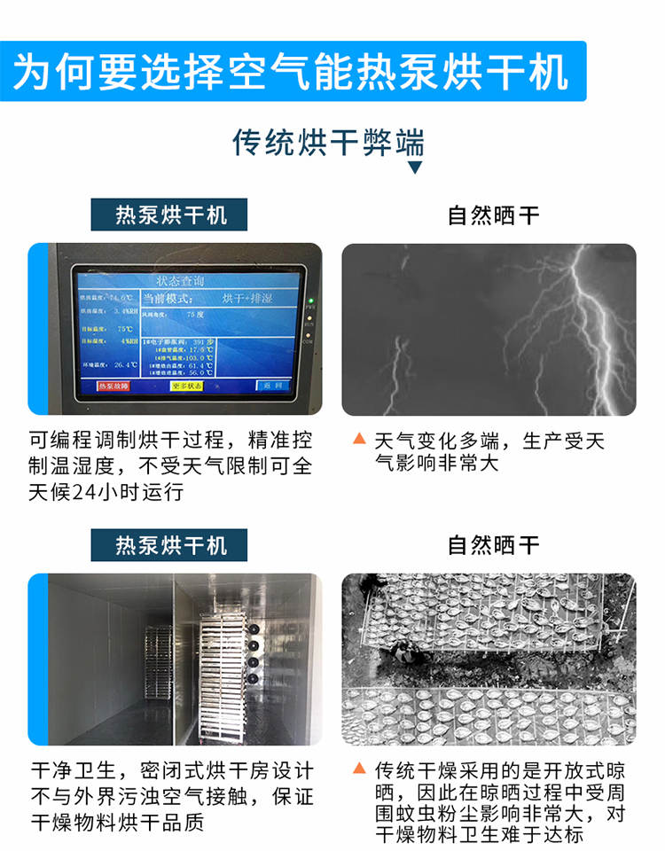 030S-T-KD06空氣能烘幹機,可編程調製烘幹過程,精準控製溫濕度,不受天氣限製可全天候24小時運行。幹淨衛生,密閉式烘幹房設計不與外界汙濁空氣接觸,保證幹燥物料烘幹品質。高效節能,不用專人看守,可實現一人同時管理多間烘房減少人工費用