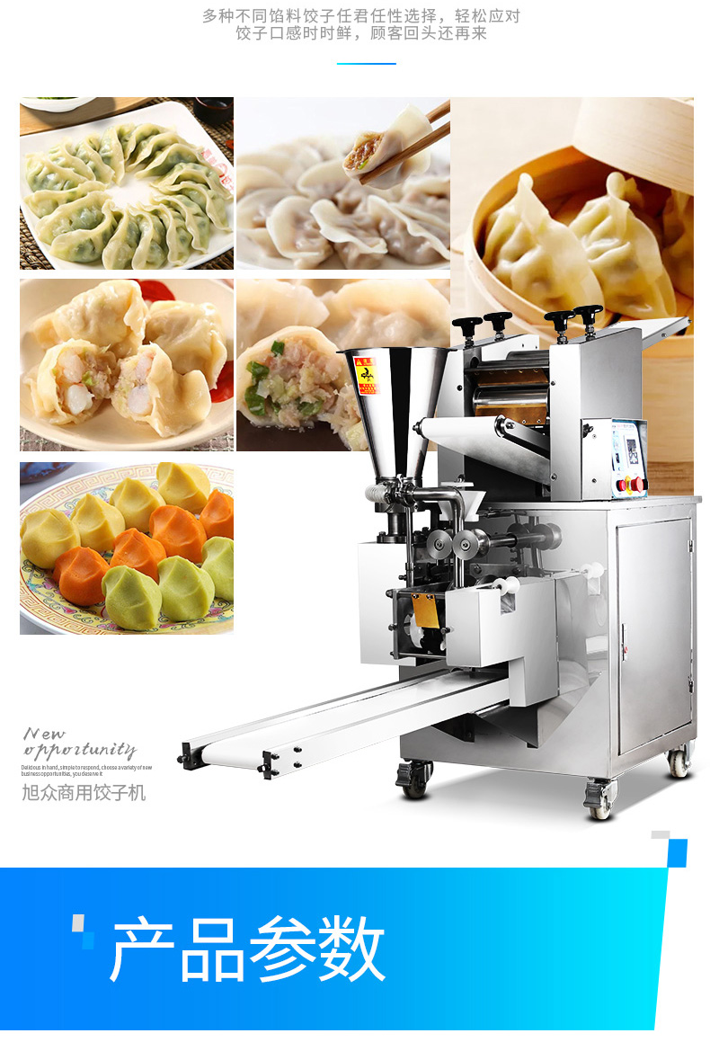 JGB-210型仿手工餃子機,本機采用自動壓麵皮包餃子的新工藝技術,本機可生產速凍餃子等,能生產各種肉餡、肉菜混合餡、全菜餡及其他種餡的餃子,適用於餃子館、食品生產廠家、賓館、飯店、餐廳、團體食堂、學校、部隊。免費上門安裝調試,贈送麵點工藝